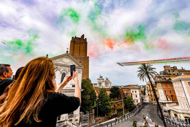 A equipe acrobática de Frecce Tricolori voa durante as comemorações do Dia da República em Roma, na Itália