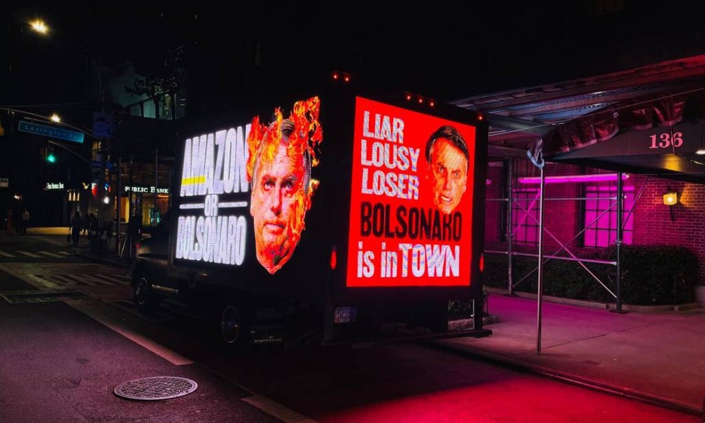 Alguns ministros o acompanharam no evento, que faz parte da agenda oficial da visita à Nova York por causa da Assembleia Gera das Nações Unidas. Usando um tambor, o grupo gritava “Bolsonaro, pode esperar, a sua hora vai chegar” e “genocida”. Havia ainda um caminhão com telões que exibem imagens de Bolsonaro cercado por chamas e as frases em inglês “cadeia para Bolsonaro” e “Bolsonaro está queimando a Amazônia”, dentre outras.