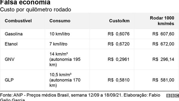 A pedido da BBC News Brasil, o especialista em finanças estimou o custo por quilômetro rodado dos diversos tipos de combustíveis, considerando um preço médio de R$ 6,076 por litro para a gasolina, R$ 4,704 por litro para o etanol, R$ 4,146 por metro cúbico para o GNV e R$ 16,12 por metro cúbico para o GLP (equivalente a R$ 98,33 por botijão de 13 kg).