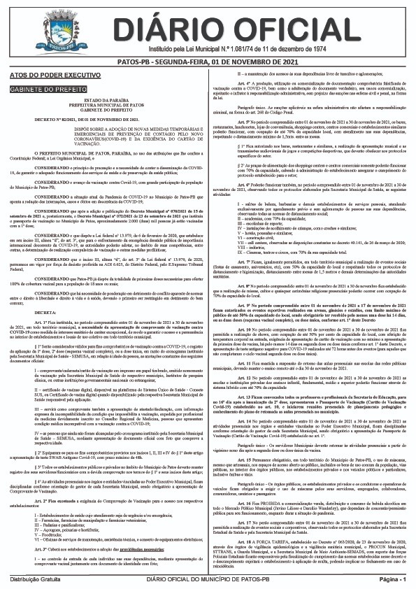 O novo decreto do município de Patos, publicado na última segunda-feira, dia 1º de Novembro, com vigência até 30 de novembro, disciplina as novas medidas temporárias e emergenciais de prevenção de contágio pelo novo coronavírus e a exigência do cartão de vacinação.