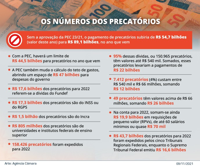 Pelas regras atuais, dados do governo indicam um pagamento com precatórios de R$ 89,1 bilhões em 2022, frente aos R$ 54,7 bilhões de 2021. Outros R$ 47 bilhões de folga orçamentária serão abertos com a mudança no cálculo da correção do teto de gastos. Segundo o secretário especial do Tesouro e Orçamento, Esteves Colnago, cerca de R$ 50 bilhões devem ir para o programa Auxílio Brasil e R$ 24 bilhões para ajustar os benefícios vinculados ao salário mínimo.