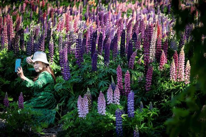 Um campo de tremoço está em plena floração na Ilha de Lolland, na Dinamarca