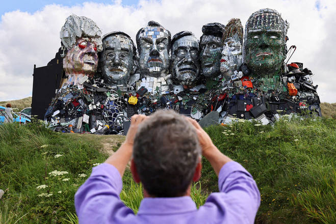 Um homem fotografa a "Mount Recyclemore", uma obra de arte feita por Joe Rush e Alex Wrekage a partir de lixo eletrônico. A escultura representa os rostos dos líderes do G7, que se reúnem em Cornualha, condado localizado no Reino Unido
