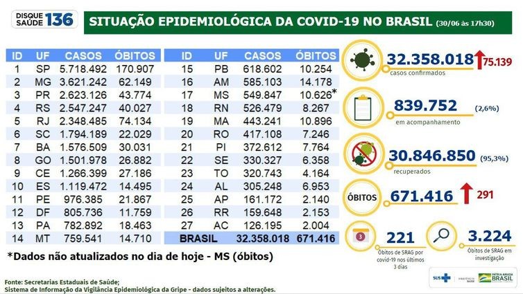Com as novas informações, o total de pessoas infectadas pelo novo coronavírus durante a pandemia já soma 32.358.018.