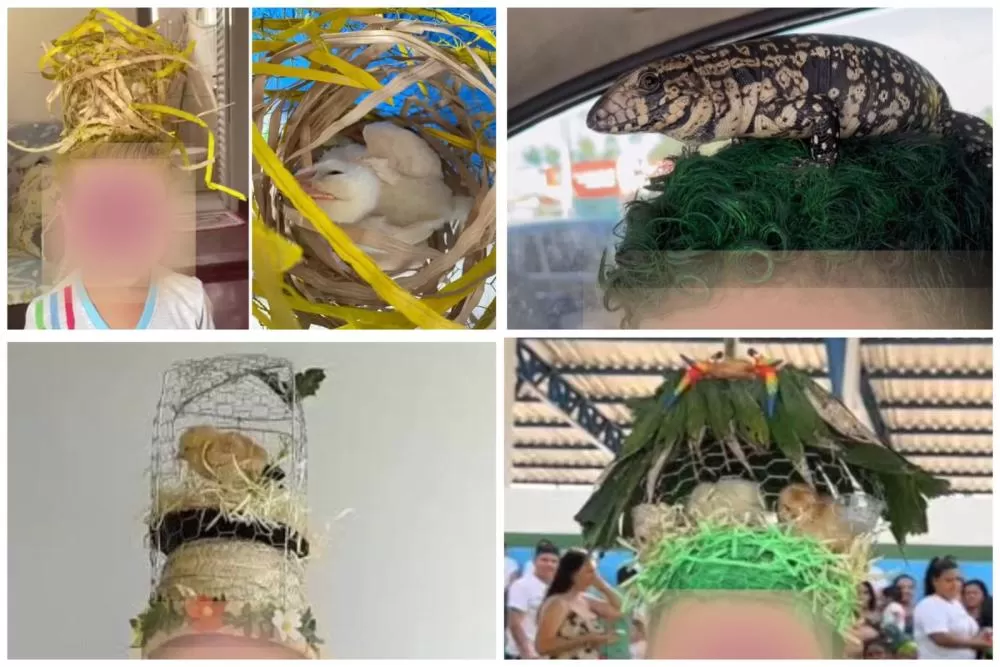 Em vídeos e imagens que circulam na internet, é possível ver crianças com pintinhos, pássaros e até lagartos incorporados aos penteados do ‘cabelo maluco’.