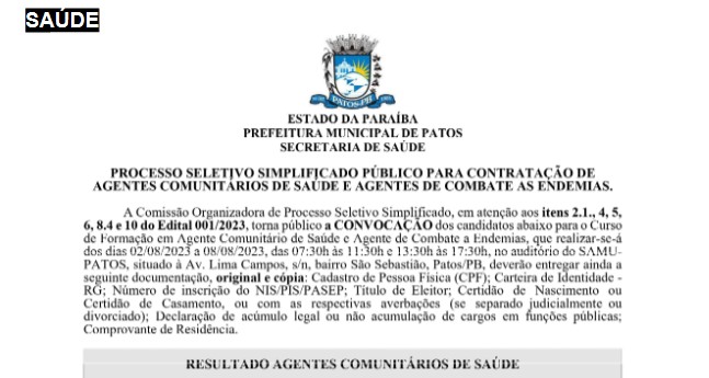 Segunda Chamada - Edital convoca aprovados no processo seletivo para ACS e ACE em Patos. Confira