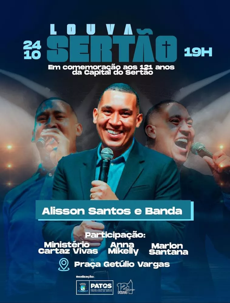 Este ano, o Louva Sertão irá acontecer mais uma vez na praça Getúlio Vargas, a partir das 19h, e contará com o show do renomado cantor Alisson Santos, do Ministério de louvor Cartas Vivas, e dos cantores Marlon Santana e Anna Mikelly.