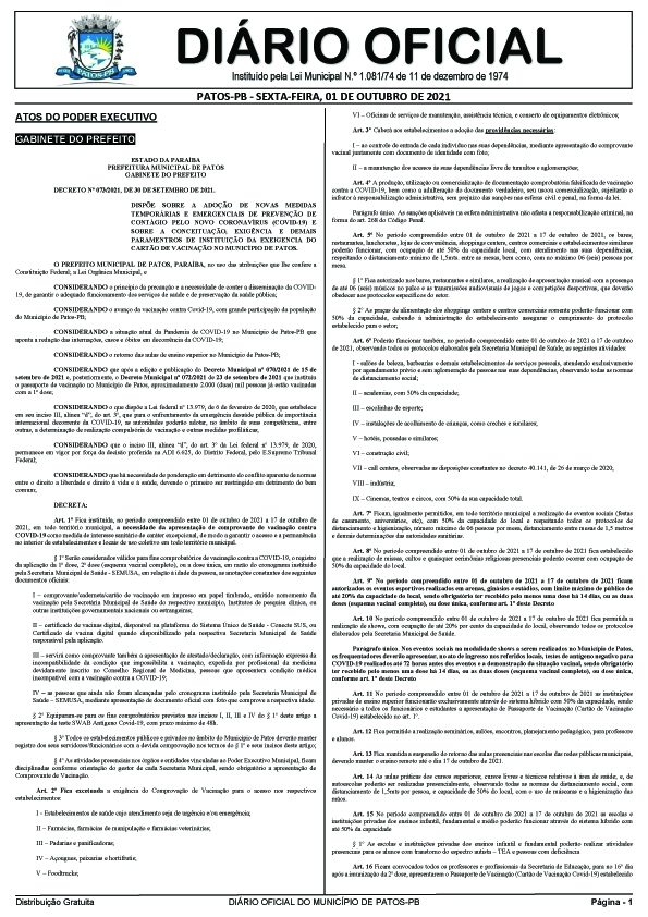 Prefeitura de Patos publica decreto com vigência de 1º a 17 de outubro; confira o documento