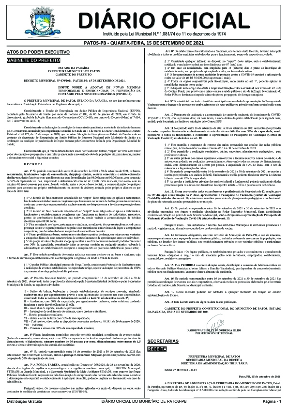Prefeitura de Patos edita decreto com relação às medidas de enfrentamento à covid-19