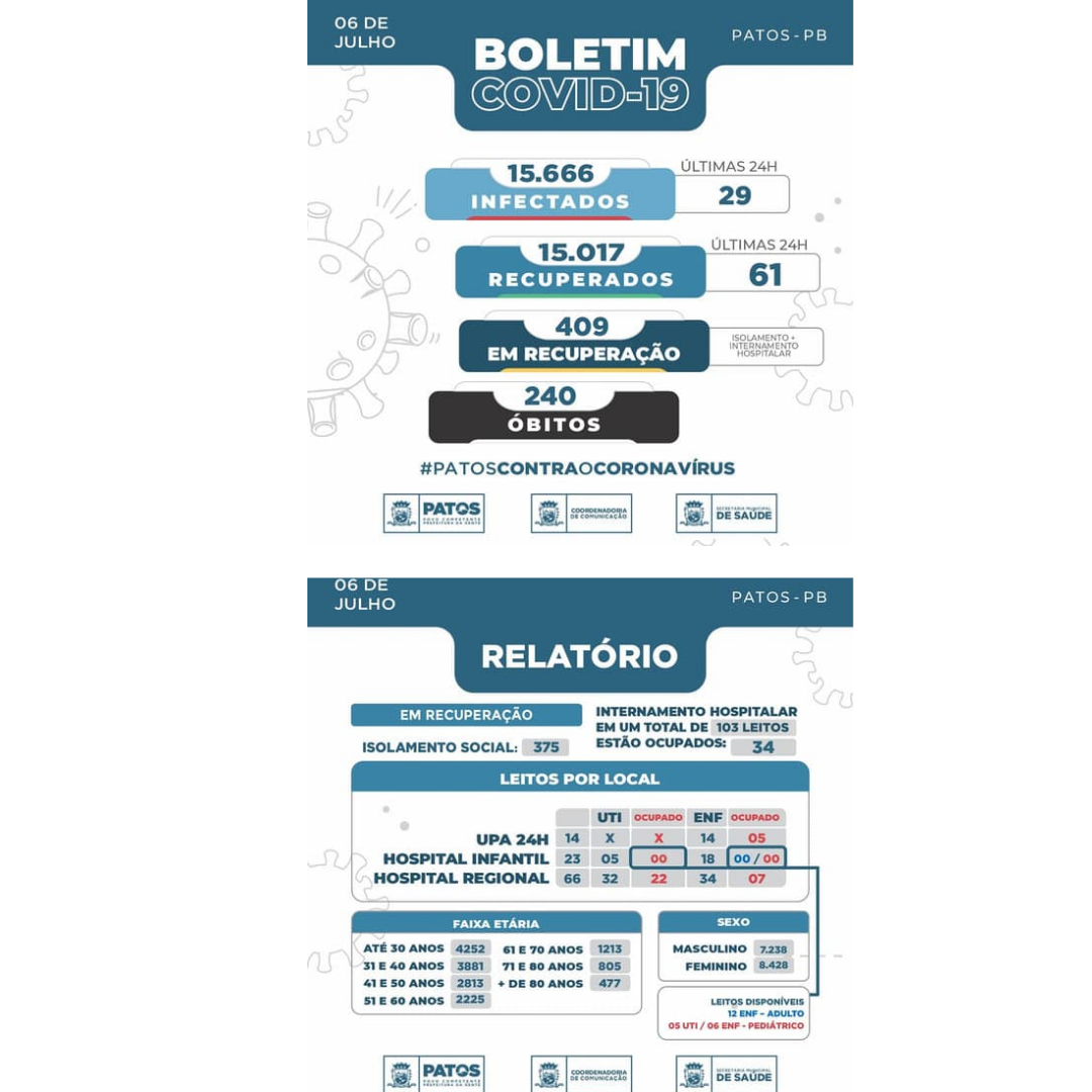 Desde o início da pandemia do novo coronavírus, a cidade de Patos registrou o total de 15.637 pessoas infectadas pelo vírus.